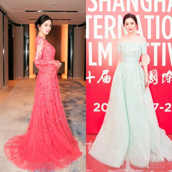 本次带着两部作品的杨幂一粉一绿清新雅致出席红毯。 随《绣春刀·修罗战场》剧组亮相时,Zuhair Murad Spring 2017 薄荷绿小露肩;而为《逆时营救》助阵时,又换上了一袭Zuhair Murad Resort 2017桃粉色薄纱长裙,妩媚而俏皮。
