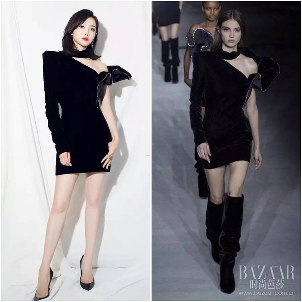 大美茜宋茜则以Saint Laurent 2017秋冬系列酷黑短裙帅气亮相,不对称设计在潇洒中增加灵动感,垫肩和荷叶边的碰撞美帅兼备!