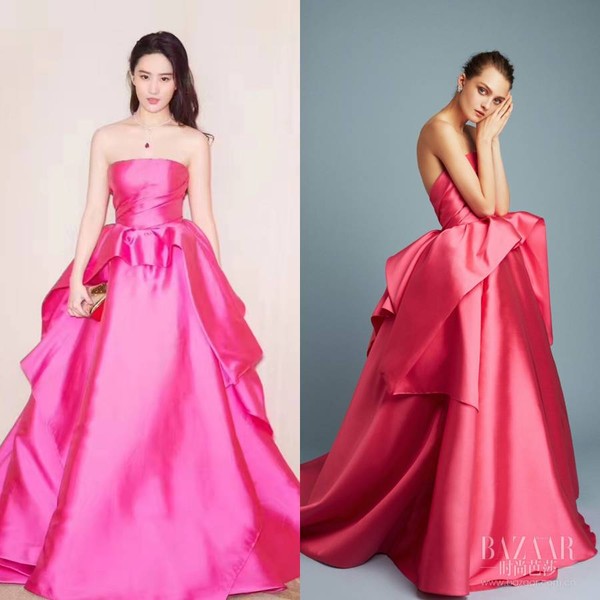 刘亦菲的粉色缎面礼裙来自Reem Acra 2017年早秋系列,搭配CHAUMET 宝石项链优雅又提气。
