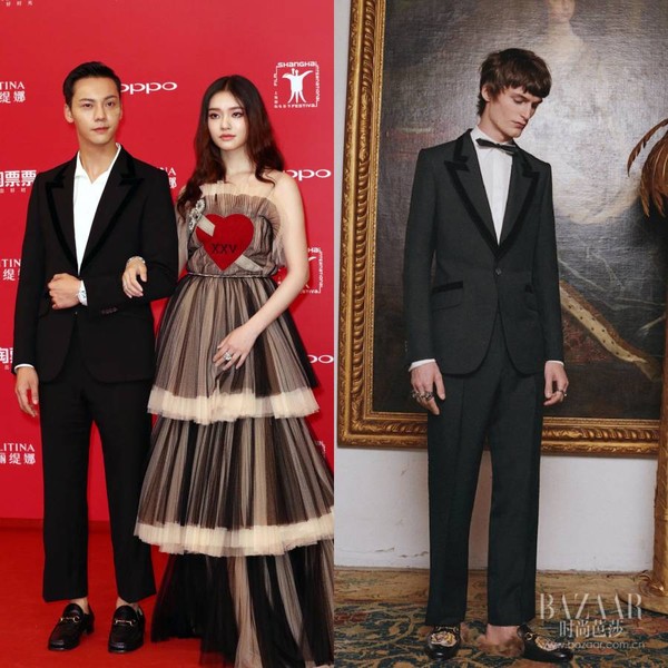 陈伟霆也一套Gucci 最新系列正装加身,搭配品牌最新系列男鞋,携手林允绅士感十足。