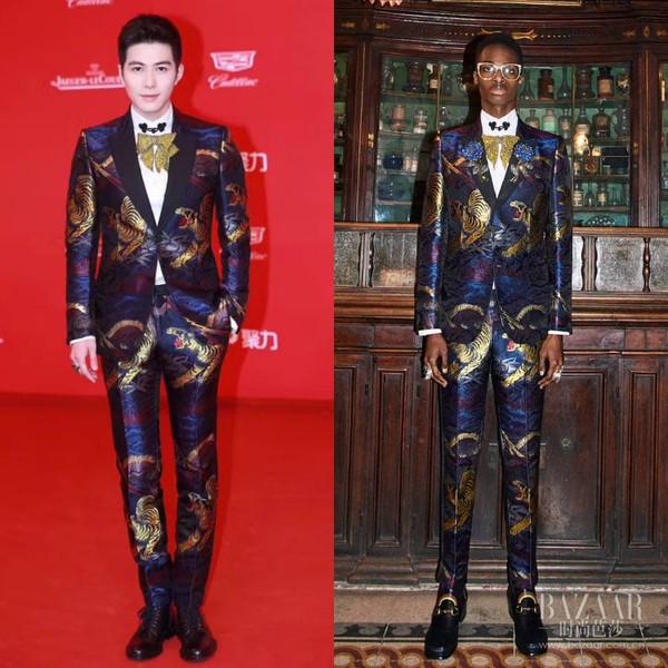 陈学冬则选择了Gucci 最新系列印花套装,金色蝴蝶结更突显时髦贵公子气。