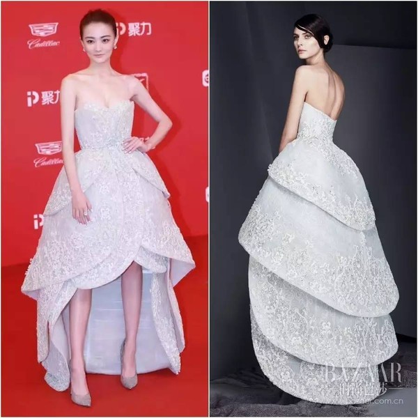 徐璐身穿Ashi Studio 2017春夏高定系列白裙,前短后长尽显长腿。脚蹬Jimmy Choo高跟,BVLGARI 配饰更衬托出细腻雪肌。