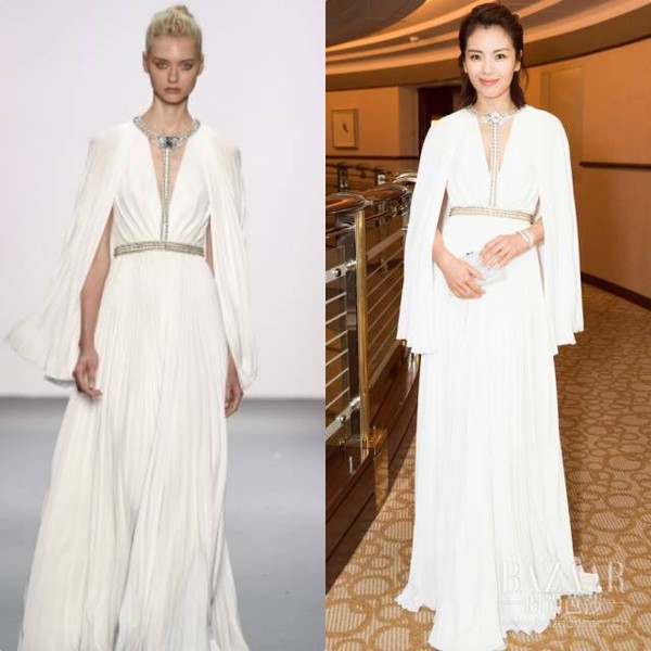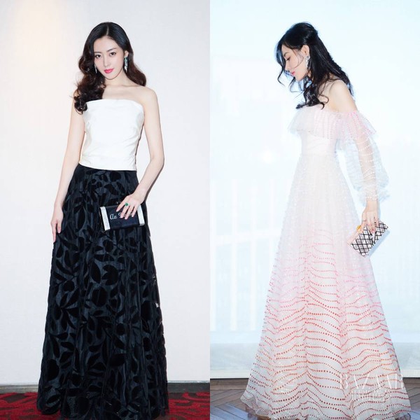 张天爱分别以Oscar de la Renta和Jenny Packham两套长裙,演绎出复古摩登女郎气质和浪漫少女感,你更爱哪套?