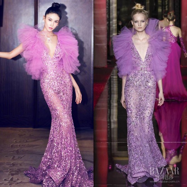 张蓝心携电影《枪炮腰花》出席红毯,Zuhair Murad 2017 高定系列紫红礼服衬托出高挑身材,薄纱袖口超吸睛!