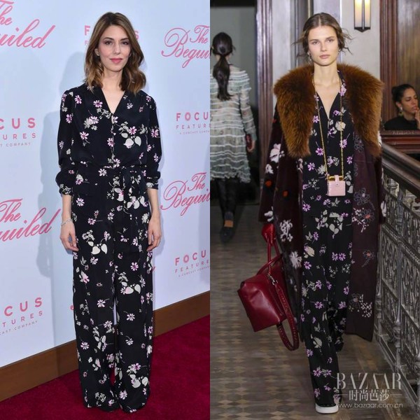 导演当天这套印花套装来自Valentino 2017早秋系列,精致而优雅的印花设计浪漫仙美,搭配细腰带提高整体腰线,凸显干练本色。