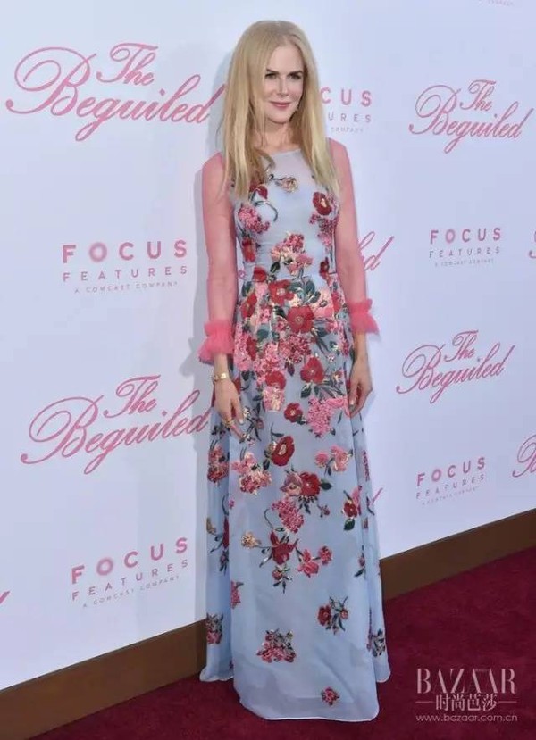 妮可·基德曼身着Carolina Herrera 2018早春度假系列礼服优雅亮相,简单的线条,柔和的色调,精致的袖口设计和花朵图案,将妮可的天真与妩媚毫无保留的展示出来。