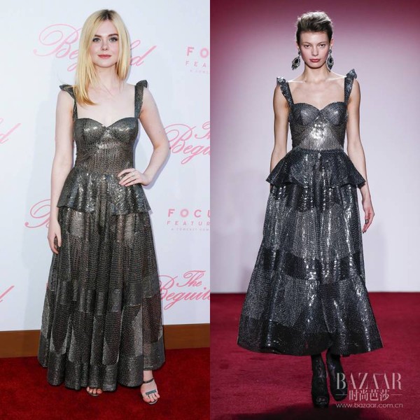小仙女Fanning身着Naeem Khan 2017秋冬系列,亮片与金属元素的结合使范宁现代感十足,荷叶边设计又不失浪漫气息。