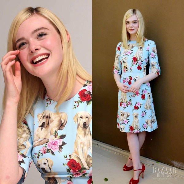 在电影《牡丹花下》 “The Beguiled”新闻发布会上,范宁换成杜嘉班纳淡蓝色小狗连衣裙搭配小红鞋,清新的少女感扑面而来,如童话中的公主一般俏皮可爱。