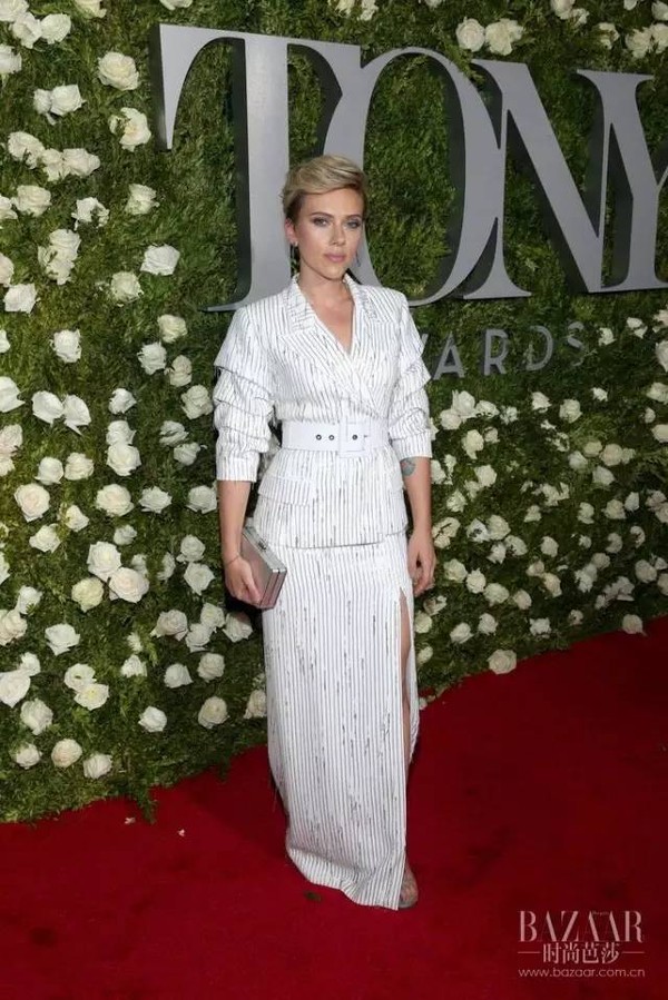 斯嘉丽身穿 Micheal Kors 夹克和同系列长裙,搭配 Stuart Weitzman 高跟鞋, 将女性的优雅与知性显露无疑,腰带的运用更是点睛之笔。