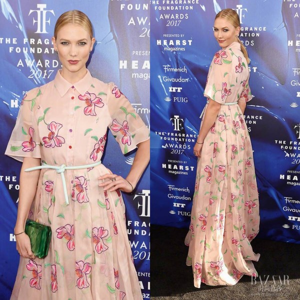 6月14日,2017香水基金会颁奖典礼在纽约举行。KK一袭Carolina Herrera印花透拼接透视小粉裙,搭配Tyler Ellis金属绿手拿包亮相,低扎马尾好清新~